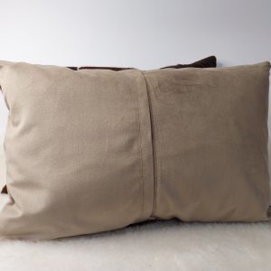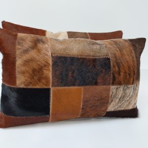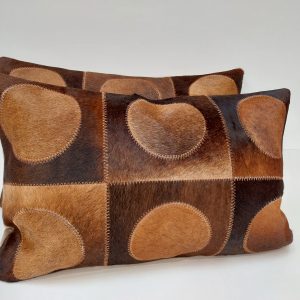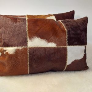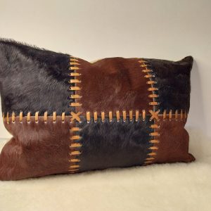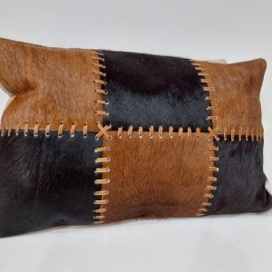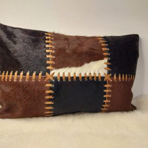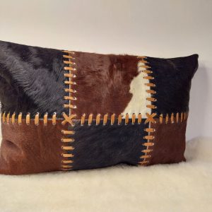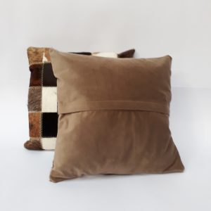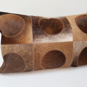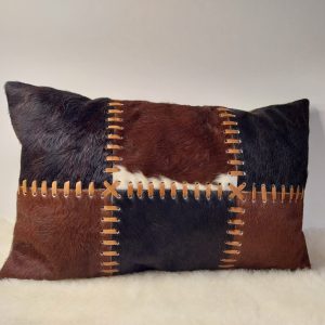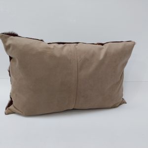 Cojín cuero natural de vacuno con pelos, Medidas 60X40 cm costuras a máquina zig – zag, reverso con tela de felpa y cierre para cambiar relleno.