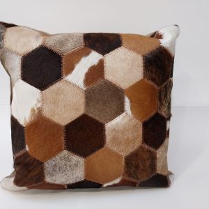 Cojines 50×50  en cuero de vacuno estilo patchwork  en diseño de hexágonos, parte trasera con tela de felpa,costuras a máquina en zig zag. El valor es por unidad.