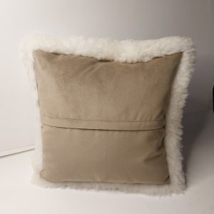 Cojín cuero natural de vacuno con pelo, medidas 60X40 cm costuras a máquina zig – zag, reverso con tela de felpa y cierre para cambiar relleno.