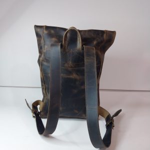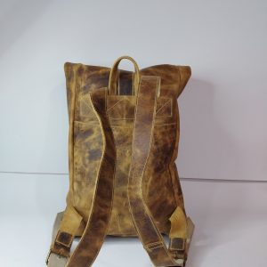 Mochila de cuero engrasado color cafe claro, con bolsillo en parte delantera e interior, tira larga ajustable. Entra muy bien un computador