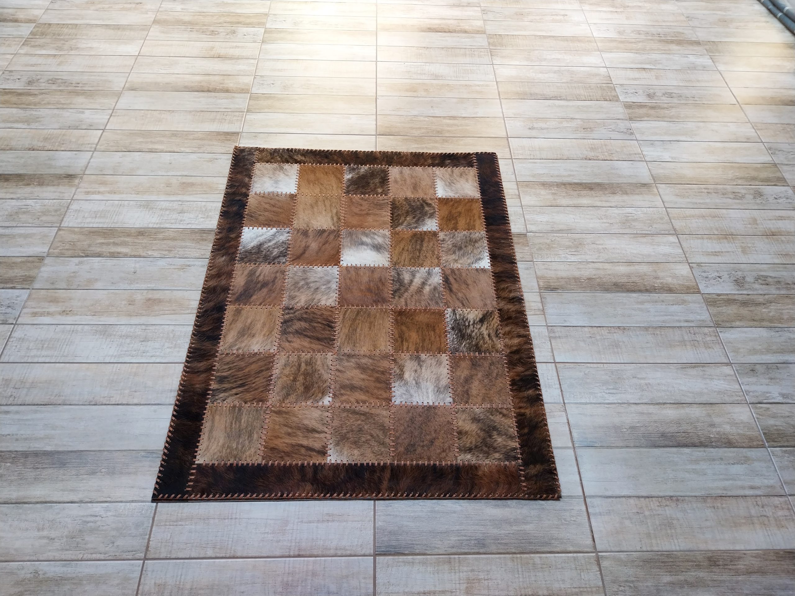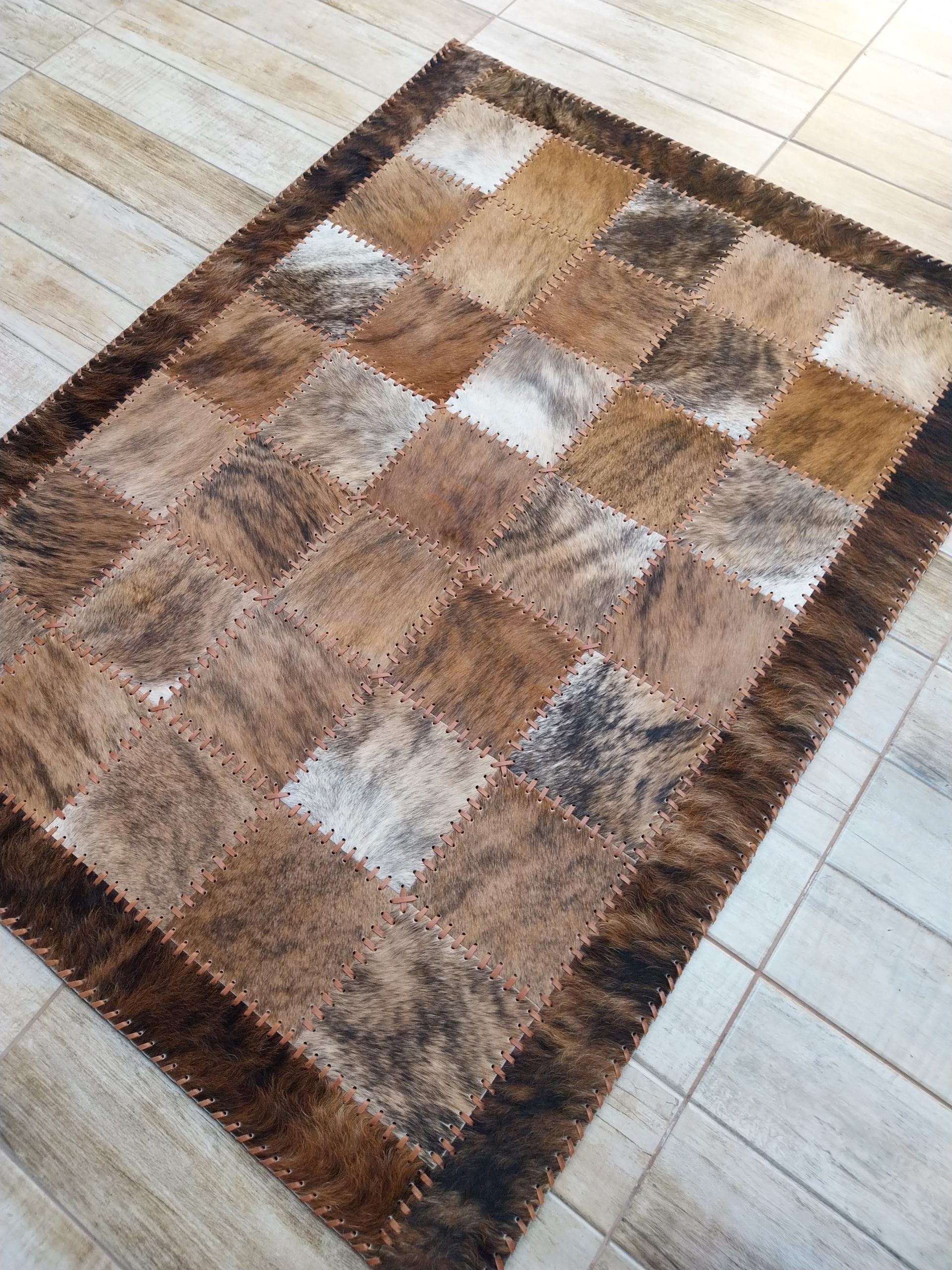 Alfombra cuero natural de vaca con pelo estilo patchwork, costura a mano, cuadros de 20×20 cm