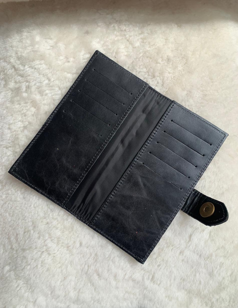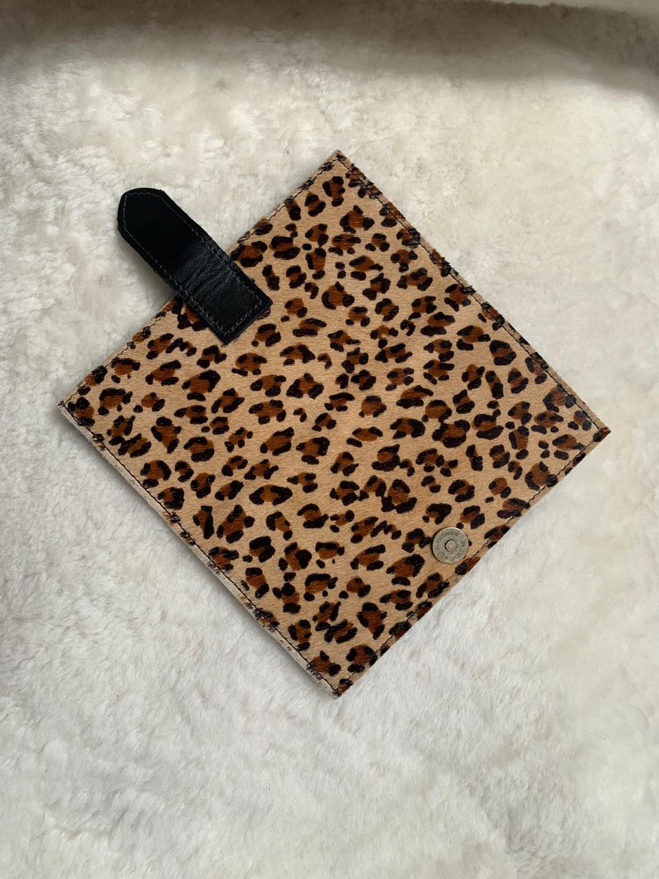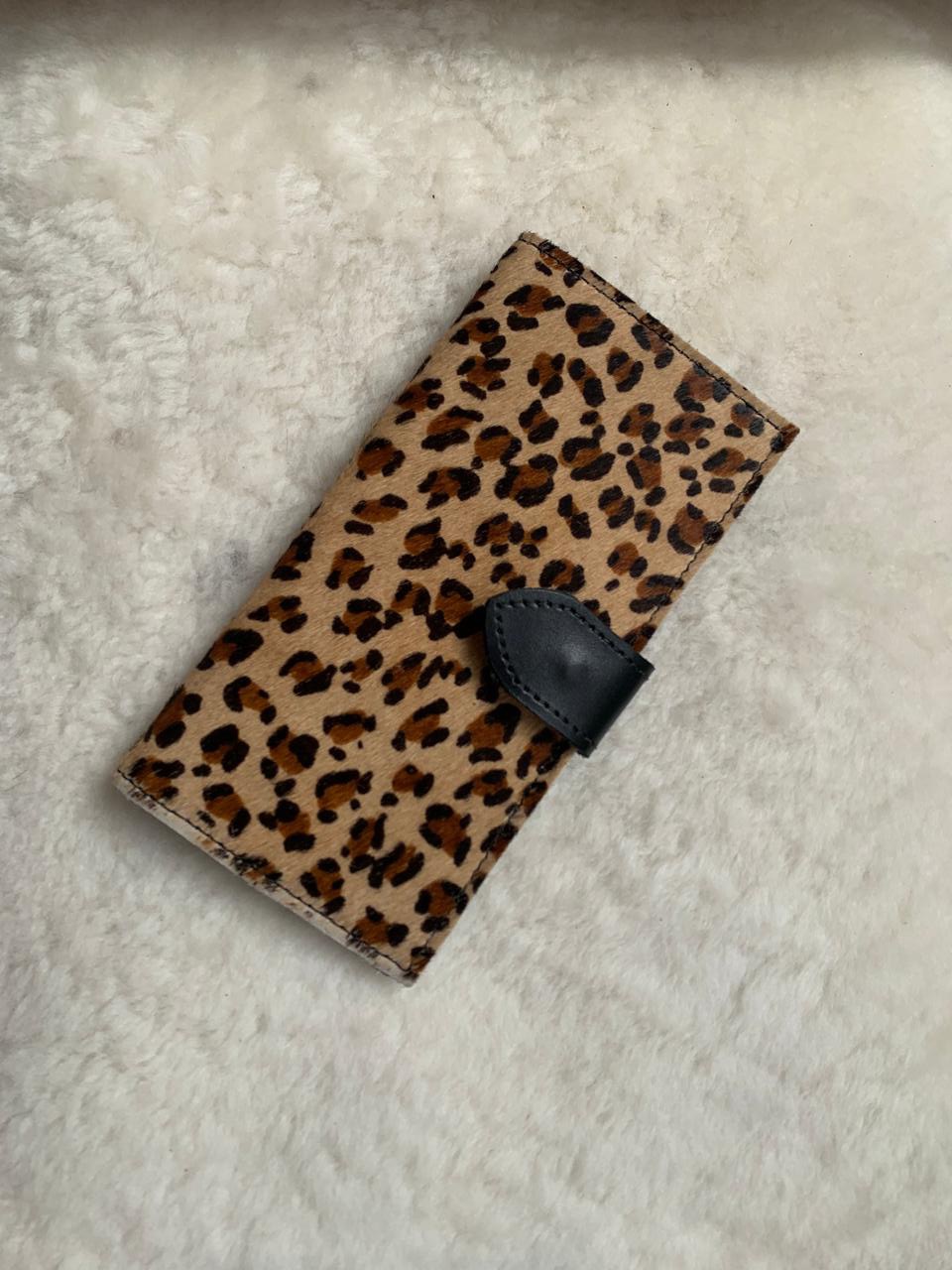 Billetera de mujer confeccionada en cuero con pelo animal print, con textura natural y acabado artesanal. Su diseño largo incluye cierre con lengüeta con imán y un delicado detalle de estrella metálica en la esquina inferior. Un accesorio sofisticado, perfecto para quienes buscan estilo y practicidad en un solo producto.