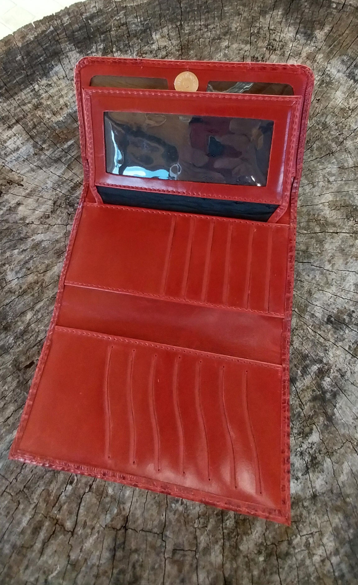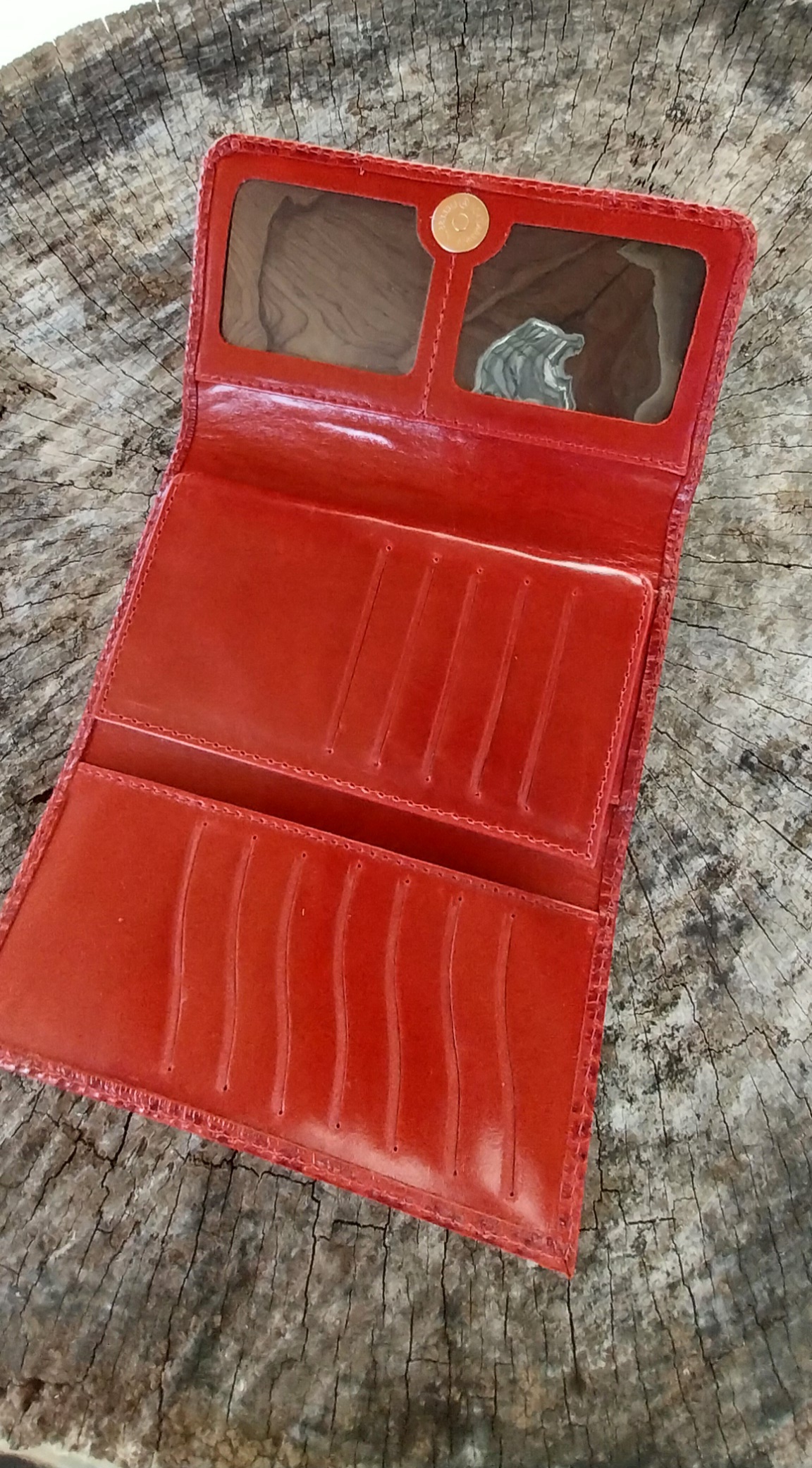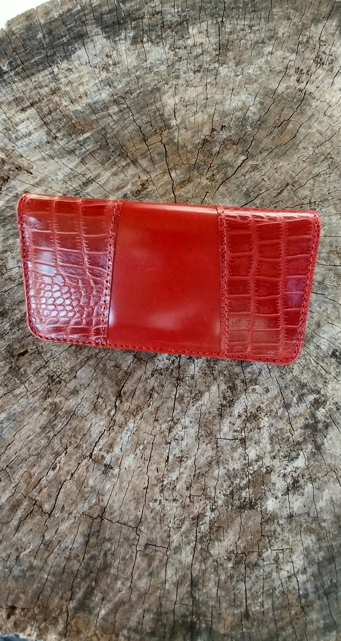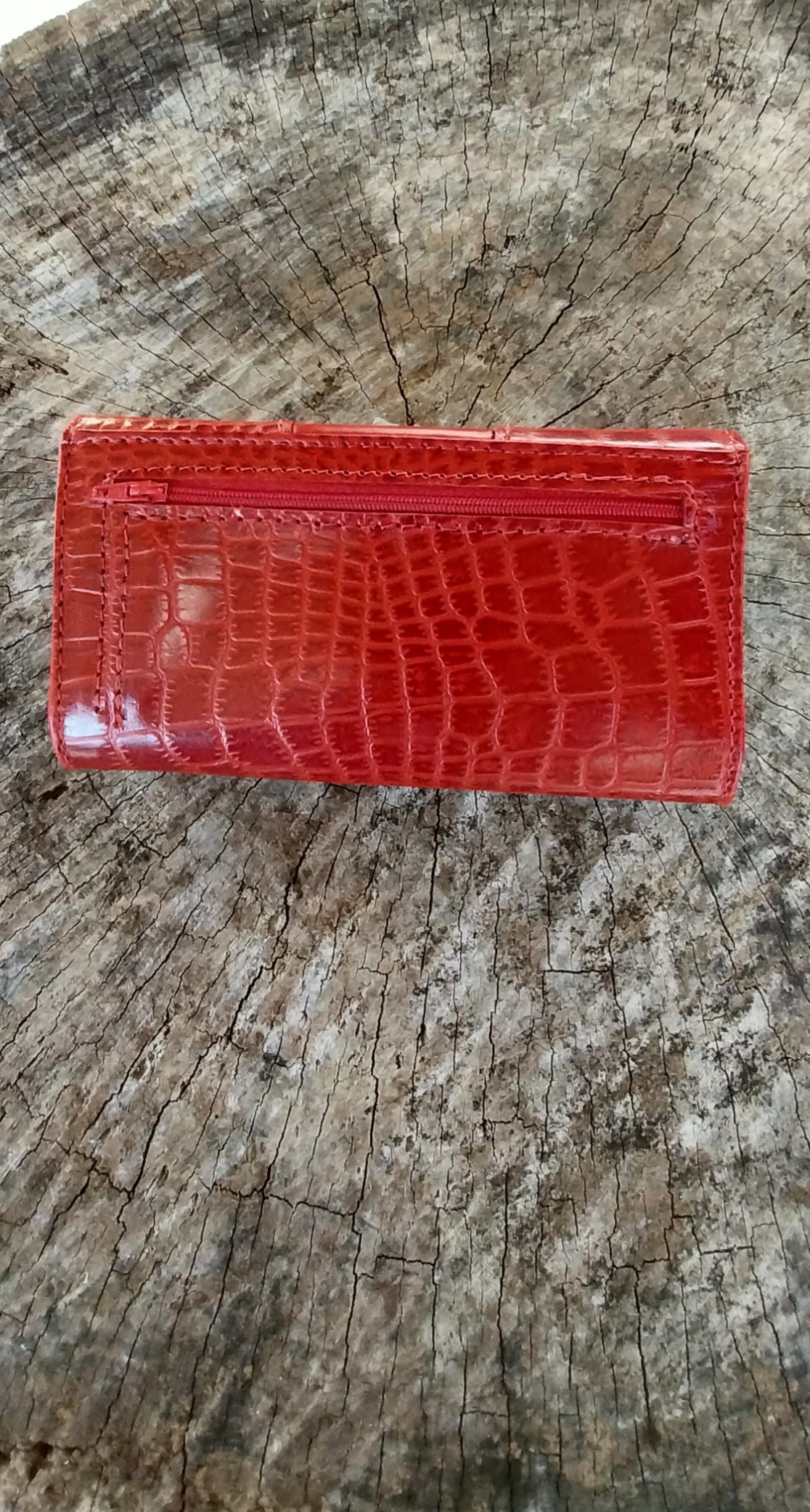 Billetera de mujer confeccionada en cuero rojo brillante, con textura natural. Su diseño largo incluye cierre con imán, 18 tarjeteros, 4 porta documentos o billetes, 2 porta carnet, un monedero.