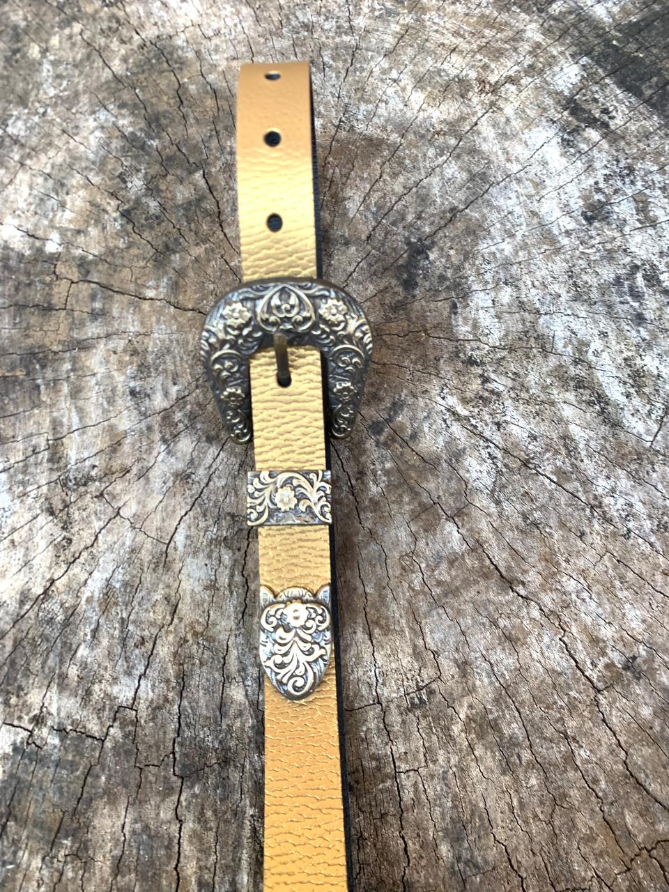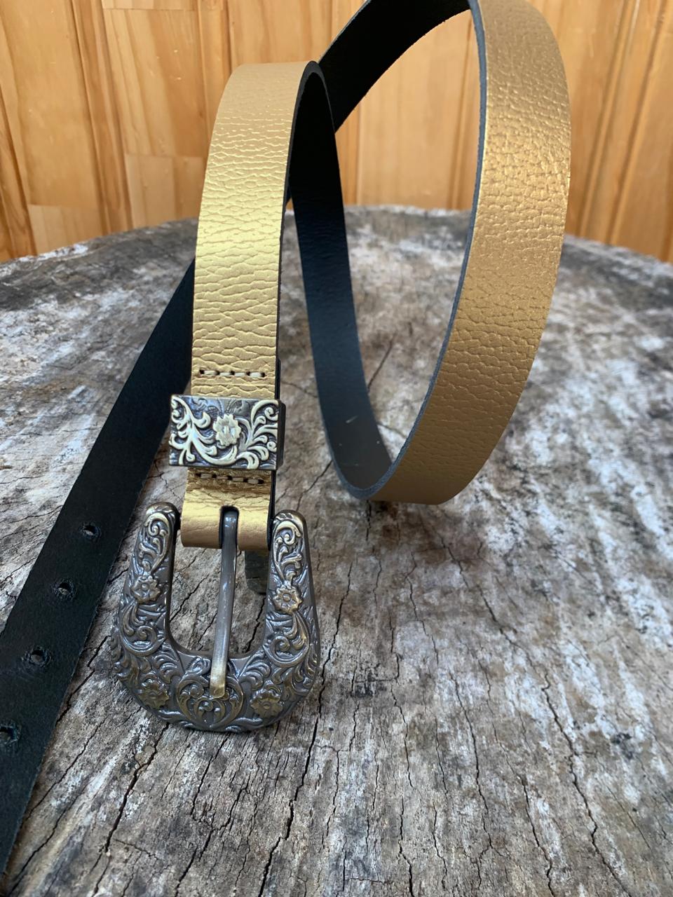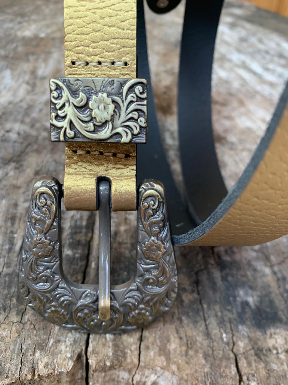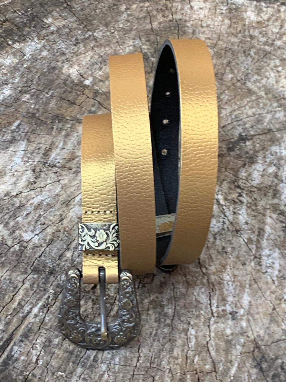 Cinturón 100% cuero, color dorado, 2,2 cm ancho y 90 cm largo, hebilla con diseño de  5×5.5 cm aprox.