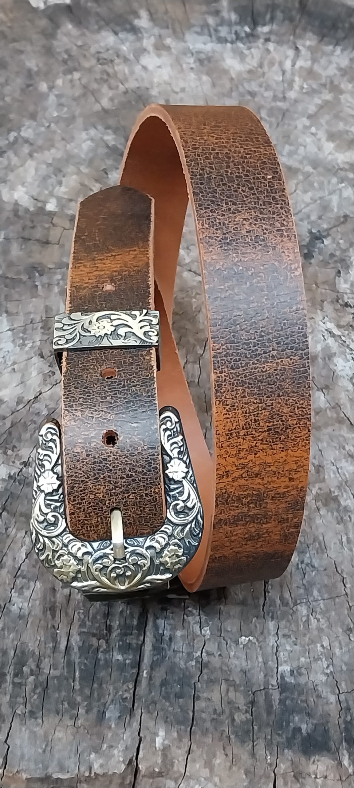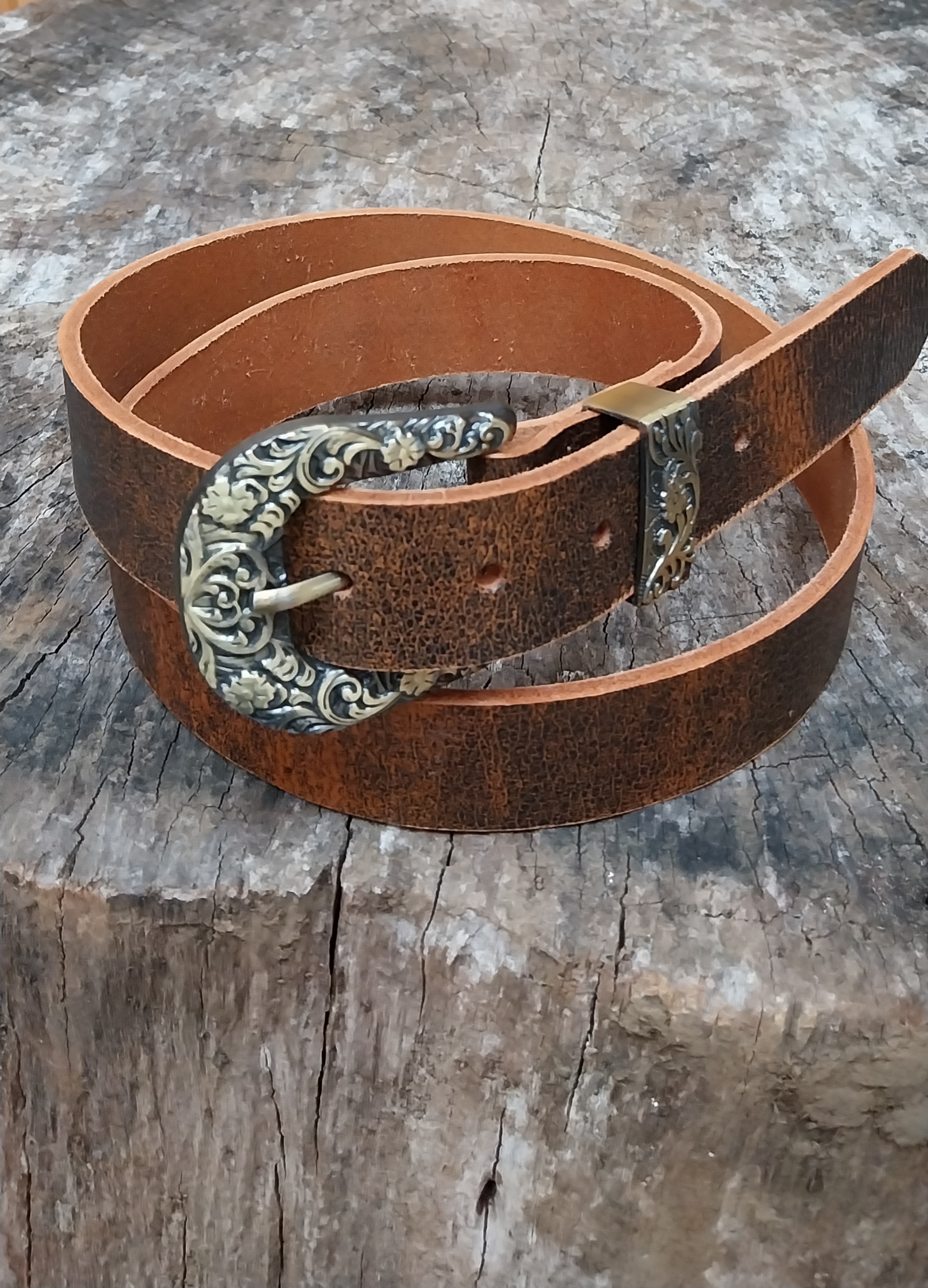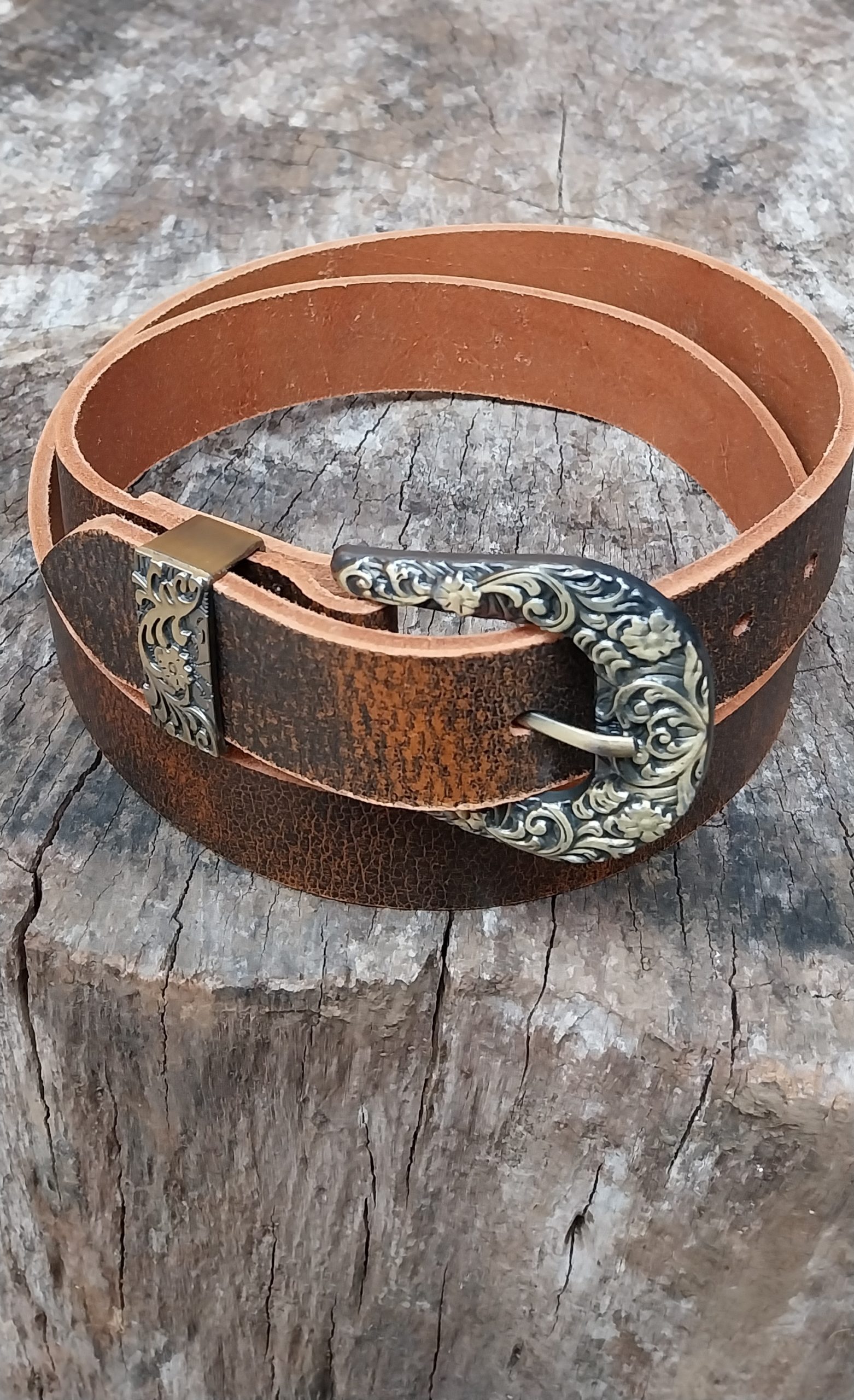 Cinturón 100% cuero, color cafe, 3,5 cm ancho y 105 cm largo, hebilla dorada envejecida con diseño de 6×6 cm