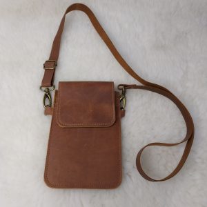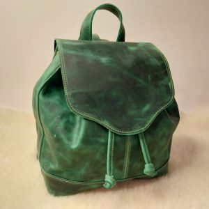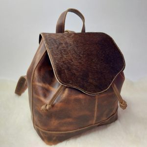 Mochila de cuero engrasado natural, con forro y bolsillos interiores y exteriores, tiras ajustables.