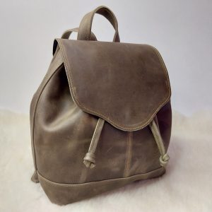 Mochila de cuero engrasado natural, con forro y bolsillos interiores y exteriores, tiras ajustables.