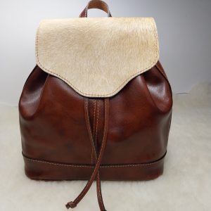 Mochila de cuero engrasado natural, con forro y bolsillos interiores y exteriores, tiras ajustables.