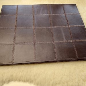 Alfombra estilo patchwork de cuero con pelos en cuadros de 20×20 cm costura con tiras de cuero y pegadas con huincha de cuero al reverso