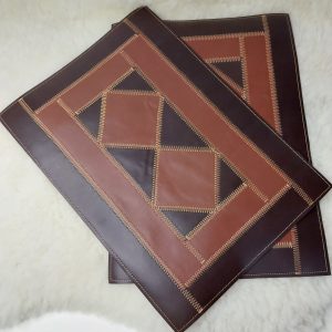 Individuales fabricados en cuero con pelo de vacuno y cuero liso, parte posterior ecocuero, diseño de rombos estilo patchwork.